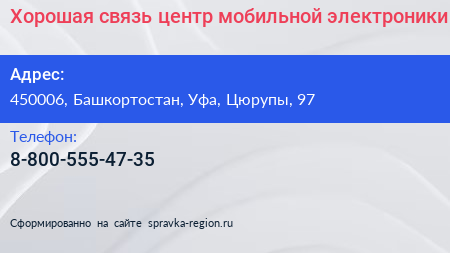 Хорошая связь, центр мобильной электроники по адресу 450006, Башкортостан, Уфа, Цюрупы, 97 в дальнейшем Организация, размещена в следующих категориях:
