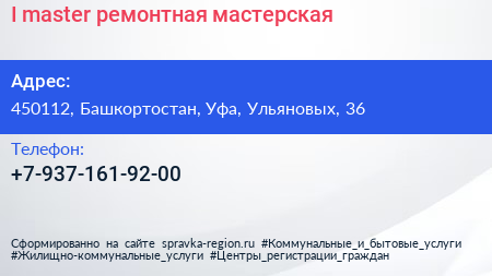 I`master, ремонтная мастерская по адресу 450112, Башкортостан, Уфа, Ульяновых, 36 в дальнейшем Организация, размещена в следующих категориях: