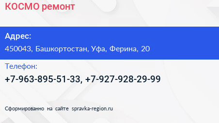 КОСМО ремонт по адресу 450043, Башкортостан, Уфа, Ферина, 20 в дальнейшем Организация, размещена в следующих категориях: