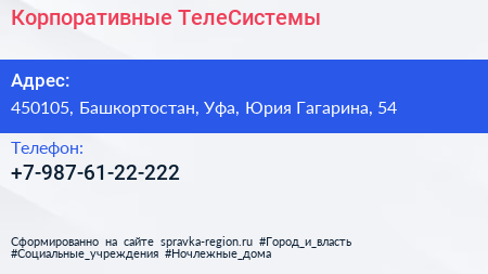 Корпоративные ТелеСистемы по адресу 450105, Башкортостан, Уфа, Юрия Гагарина, 54 в дальнейшем Организация, размещена в следующих категориях: