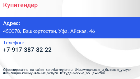 Купитендер по адресу 450078, Башкортостан, Уфа, Айская, 46 в дальнейшем Организация, размещена в следующих категориях: