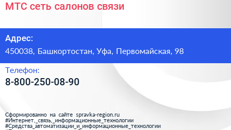 МТС, сеть салонов связи по адресу 450038, Башкортостан, Уфа, Первомайская, 98 в дальнейшем Организация, размещена в следующих категориях: