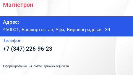 Магнетрон по адресу 450001, Башкортостан, Уфа, Кировоградская, 34 в дальнейшем Организация, размещена в следующих категориях: