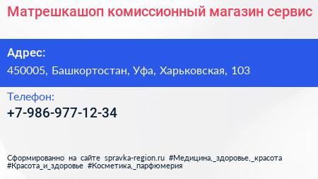 Матрешкашоп, комиссионный магазин-сервис по адресу 450005, Башкортостан, Уфа, Харьковская, 103 в дальнейшем Организация, размещена в следующих категориях: