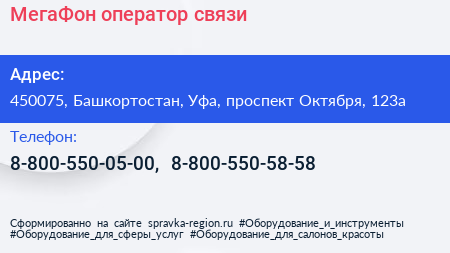 МегаФон, оператор связи по адресу 450075, Башкортостан, Уфа, проспект Октября, 123а в дальнейшем Организация, размещена в следующих категориях: