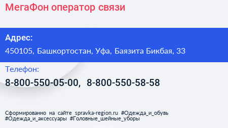 МегаФон, оператор связи по адресу 450105, Башкортостан, Уфа, Баязита Бикбая, 33 в дальнейшем Организация, размещена в следующих категориях: