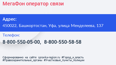 МегаФон, оператор связи по адресу 450022, Башкортостан, Уфа, улица Менделеева, 137 в дальнейшем Организация, размещена в следующих категориях: