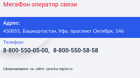 МегаФон, оператор связи по адресу 450055, Башкортостан, Уфа, проспект Октября, 146 в дальнейшем Организация, размещена в следующих категориях: