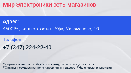 Мир Электроники, сеть магазинов по адресу 450095, Башкортостан, Уфа, Ухтомского, 10 в дальнейшем Организация, размещена в следующих категориях: