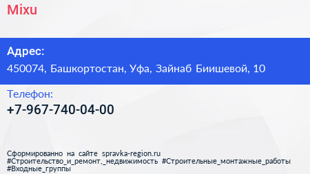 Mixu по адресу 450074, Башкортостан, Уфа, Зайнаб Биишевой, 10 в дальнейшем Организация, размещена в следующих категориях:
