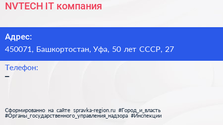 NVTECH, IT-компания по адресу 450071, Башкортостан, Уфа, 50 лет СССР, 27 в дальнейшем Организация, размещена в следующих категориях:
