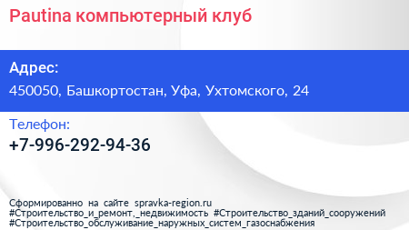 Pautina, компьютерный клуб по адресу 450050, Башкортостан, Уфа, Ухтомского, 24 в дальнейшем Организация, размещена в следующих категориях:
