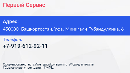 Первый Сервис по адресу 450080, Башкортостан, Уфа, Минигали Губайдуллина, 6 в дальнейшем Организация, размещена в следующих категориях: