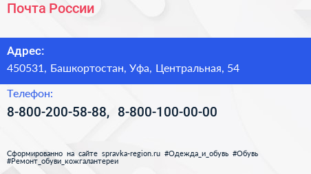 Почта России по адресу 450531, Башкортостан, Уфа, Центральная, 54 в дальнейшем Организация, размещена в следующих категориях: