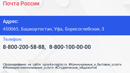 Почта России по адресу 450065, Башкортостан, Уфа, Борисоглебская, 3 в дальнейшем Организация, размещена в следующих категориях: