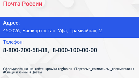 Почта России по адресу 450026, Башкортостан, Уфа, Трамвайная, 2 в дальнейшем Организация, размещена в следующих категориях: