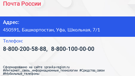 Почта России по адресу 450591, Башкортостан, Уфа, Школьная, 7/1 в дальнейшем Организация, размещена в следующих категориях: