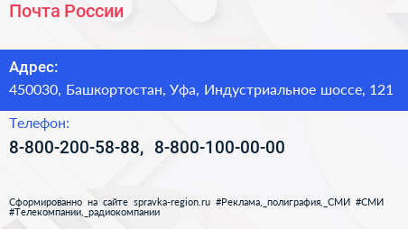 Почта России по адресу 450030, Башкортостан, Уфа, Индустриальное шоссе, 121 в дальнейшем Организация, размещена в следующих категориях: