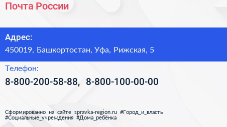 Почта России по адресу 450019, Башкортостан, Уфа, Рижская, 5 в дальнейшем Организация, размещена в следующих категориях: