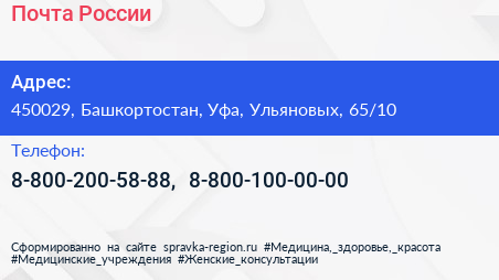 Почта России по адресу 450029, Башкортостан, Уфа, Ульяновых, 65/10 в дальнейшем Организация, размещена в следующих категориях: