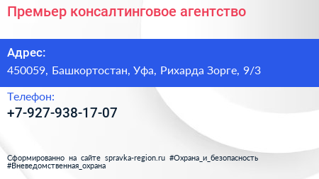 Премьер, консалтинговое агентство по адресу 450059, Башкортостан, Уфа, Рихарда Зорге, 9/3 в дальнейшем Организация, размещена в следующих категориях: