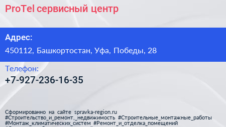 ProTel, сервисный центр по адресу 450112, Башкортостан, Уфа, Победы, 28 в дальнейшем Организация, размещена в следующих категориях: