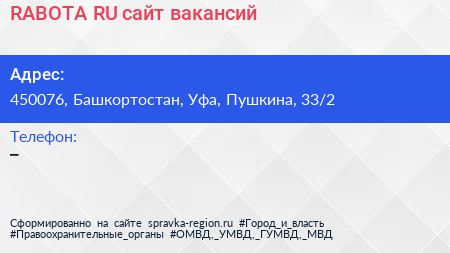 RABOTA.RU, сайт вакансий по адресу 450076, Башкортостан, Уфа, Пушкина, 33/2 в дальнейшем Организация, размещена в следующих категориях: