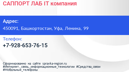 САППОРТ ЛАБ, IT-компания по адресу 450091, Башкортостан, Уфа, Ленина, 99 в дальнейшем Организация, размещена в следующих категориях: