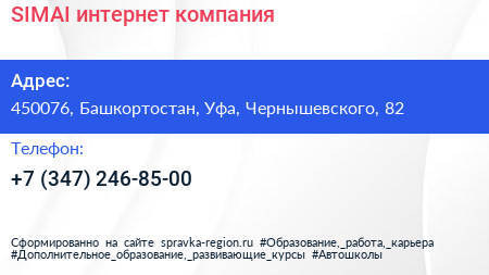 SIMAI, интернет-компания по адресу 450076, Башкортостан, Уфа, Чернышевского, 82 в дальнейшем Организация, размещена в следующих категориях:
