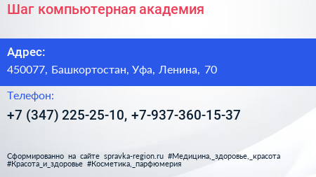 Шаг, компьютерная академия по адресу 450077, Башкортостан, Уфа, Ленина, 70 в дальнейшем Организация, размещена в следующих категориях: