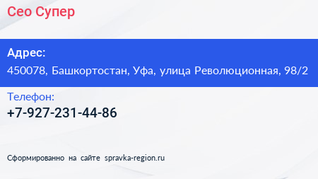 Сео Супер по адресу 450078, Башкортостан, Уфа, улица Революционная, 98/2 в дальнейшем Организация, размещена в следующих категориях: