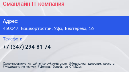 Сманлайн, IT-компания по адресу 450047, Башкортостан, Уфа, Бехтерева, 16 в дальнейшем Организация, размещена в следующих категориях:
