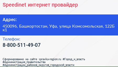 Speedinet, интернет-провайдер по адресу 450096, Башкортостан, Уфа, улица Комсомольская, 122Б к1 в дальнейшем Организация, размещена в следующих категориях: