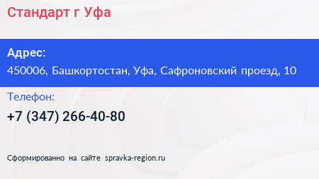 Стандарт, г. Уфа по адресу 450006, Башкортостан, Уфа, Сафроновский проезд, 10 в дальнейшем Организация, размещена в следующих категориях: