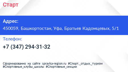 Старт по адресу 450059, Башкортостан, Уфа, Братьев Кадомцевых, 5/1 в дальнейшем Организация, размещена в следующих категориях: