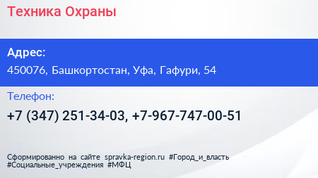Техника Охраны по адресу 450076, Башкортостан, Уфа, Гафури, 54 в дальнейшем Организация, размещена в следующих категориях: