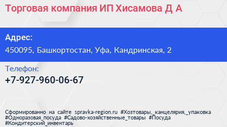 Торговая компания, ИП Хисамова Д.А. по адресу 450095, Башкортостан, Уфа, Кандринская, 2 в дальнейшем Организация, размещена в следующих категориях: