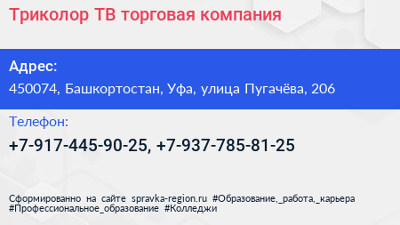 Триколор ТВ, торговая компания по адресу 450074, Башкортостан, Уфа, улица Пугачёва, 206 в дальнейшем Организация, размещена в следующих категориях:
