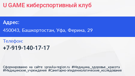 U-GAME, киберспортивный клуб по адресу 450043, Башкортостан, Уфа, Ферина, 29 в дальнейшем Организация, размещена в следующих категориях: