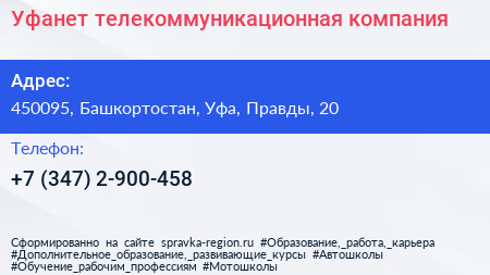 Для связи с организацией воспользуйтесь номером телефона: +7 (347) 2-900-458. Ежедневно с 10:00 до 14:00, вы можете обратиться в эту организацию.