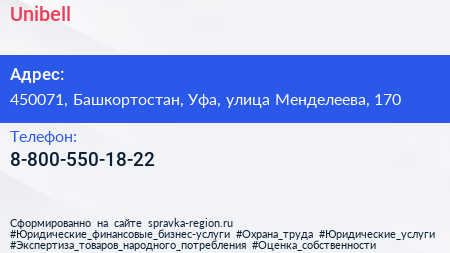 Unibell по адресу 450071, Башкортостан, Уфа, улица Менделеева, 170 в дальнейшем Организация, размещена в следующих категориях: