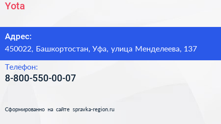Yota по адресу 450022, Башкортостан, Уфа, улица Менделеева, 137 в дальнейшем Организация, размещена в следующих категориях: