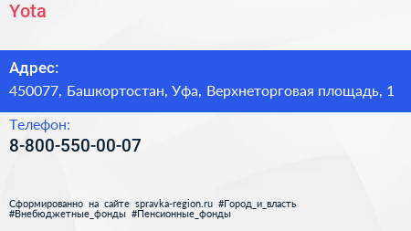 Yota по адресу 450077, Башкортостан, Уфа, Верхнеторговая площадь, 1 в дальнейшем Организация, размещена в следующих категориях: