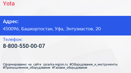 Yota по адресу 450096, Башкортостан, Уфа, Энтузиастов, 20 в дальнейшем Организация, размещена в следующих категориях: