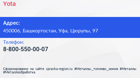 Yota по адресу 450006, Башкортостан, Уфа, Цюрупы, 97 в дальнейшем Организация, размещена в следующих категориях: