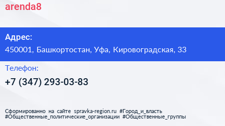 arenda8 по адресу 450001, Башкортостан, Уфа, Кировоградская, 33 в дальнейшем Организация, размещена в следующих категориях: