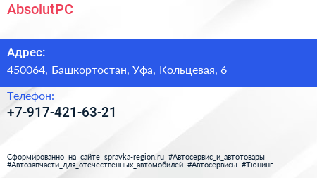 AbsolutPC по адресу 450064, Башкортостан, Уфа, Кольцевая, 6 в дальнейшем Организация, размещена в следующих категориях: