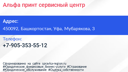 Альфа принт, сервисный центр по адресу 450092, Башкортостан, Уфа, Мубарякова, 3 в дальнейшем Организация, размещена в следующих категориях: