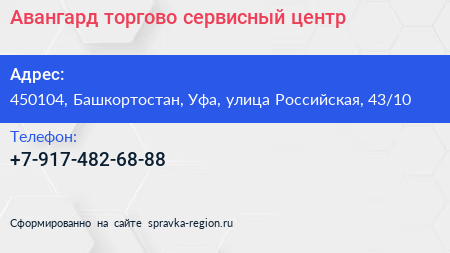 Авангард, торгово-сервисный центр по адресу 450104, Башкортостан, Уфа, улица Российская, 43/10 в дальнейшем Организация, размещена в следующих категориях: