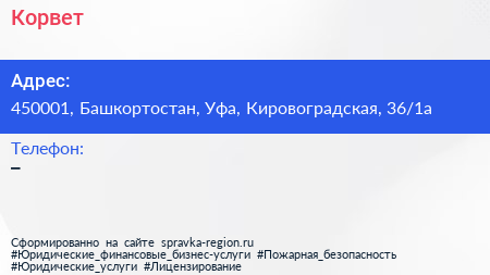 Корвет по адресу 450001, Башкортостан, Уфа, Кировоградская, 36/1а в дальнейшем Организация, размещена в следующих категориях: